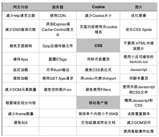 讓我們先來(lái)看這樣一個(gè)場(chǎng)景,也許我們的網(wǎng)站設計做的很漂亮,交互做得也很好,但是用戶(hù)在使用頁(yè)面的時(shí)候卻經(jīng)常會(huì )遇到點(diǎn)擊頁(yè)面出現遲緩的現象,大大影響了頁(yè)面的打開(kāi)率。據統計,由于頁(yè)面跳轉停留時(shí)間長(cháng)或者打開(kāi)率低而造成的用戶(hù)流失率簡(jiǎn)直高達20%,就這你受得了?這里我為大家總結了一個(gè)表,從不同的角度優(yōu)化頁(yè)面,經(jīng)供參考:
